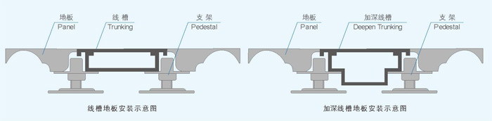 A trough floor office overhead, including several block floor body, characterized in that it comprises several blocks around the board body and white floor trunking group golf activities, the activity is a hollow wiring groove flooring floor. The utility model is reasonable around the board body disposed between the wiring activities may trunking floor, raised floor with trunking set in one, not only can reduce the installed floor level, improve the utilization of floor space, but also further enhance the raised floor function, the various lines arranged by trunking to reach anywhere in the office, wiring flexibility, according to national regulatory requirements and can be strong, weak separately isolated and marked with a color or it will separate the wiring groove area, facilitate future secondary cabling and repair and maintenance. Just open additional wiring duct cover plate can be wiring and repair, saving time, effort, expense.