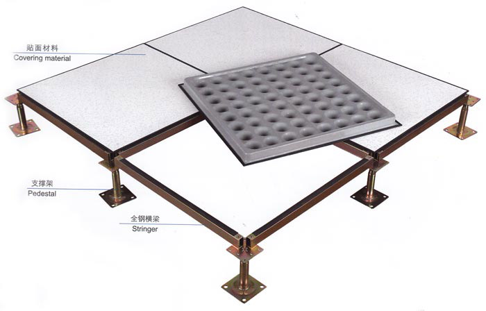 全鋼組成,四角獨(dú)立支撐架結(jié)構(gòu),地板底面采用ST14拉伸板,表面選用SPCC硬質(zhì)鋼材,地板表面經(jīng)過(guò)導(dǎo)電環(huán)氧樹(shù)脂靜電噴塑處理,內(nèi)腔發(fā)泡水泥填充,四角沖角鎖孔。支座采用鍍鋅或鑄鋁模壓成型,絲桿可任意調(diào)節(jié),地板四周成型有切邊與焊接兩種。